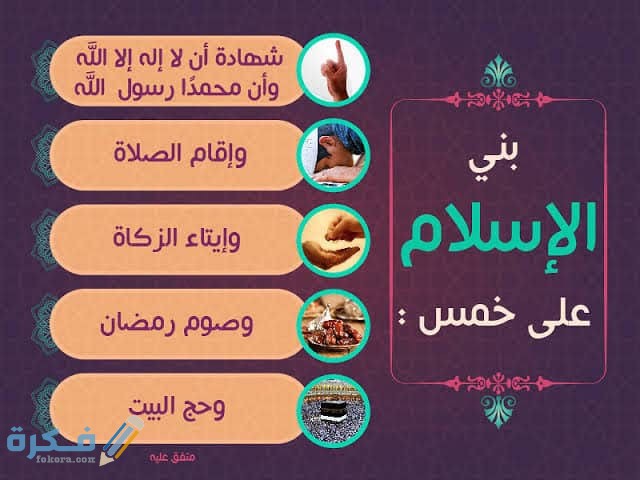 - حيث عن عبدالله بن عمر رضي الله عنه قال: سمعت رسول الله -صلى الله عليه وسلم- يقول: “بُنِيَ الإسْلَامُ علَى خَمْسٍ: شَهَادَةِ أنْ لا إلَهَ إلَّا اللَّهُ وأنَّ مُحَمَّدًا رَسولُ اللَّهِ، وإقَامِ الصَّلَاةِ، وإيتَاءِ الزَّكَاةِ، والحَجِّ، وصَوْمِ رَمَضَانَ” رواه البخاري ومسلمٌ.