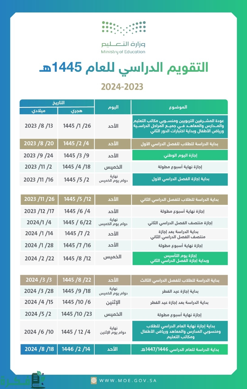 جدول التقويم الدراسي تاريخ بداية العام الدراسي الجديد حسب الخطة الدراسية 1447