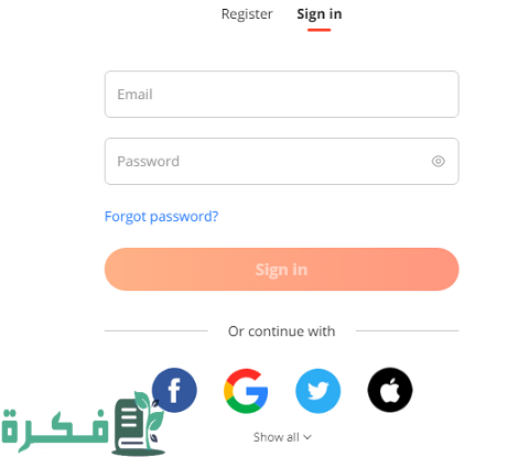 2. اكتب البريد الإلكتروني الشخصي، وكلمة المرور، أو يُمكنك تسجيل الدخول على الموقع من خلال الفيس بوك أو تويتر أو البرامج الأخرى المتوفر التسجيل بها على الموقع.