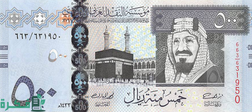 - 500 ريال: يبلغ قياس الورقة 166 x 74، كما تتميز بلونها الأزرق في طباعة ساحة “الحرم المكي والكعبة الشريفة”.