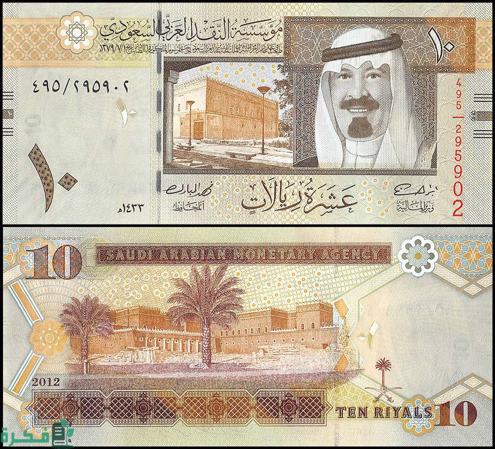 - 10 ريالات: طُبع عليها شكل الساحة الخارجية لقصر “المربع” الكائن في الرياض بالإضافة إلى “مركز الملك عبد الله المالي”.