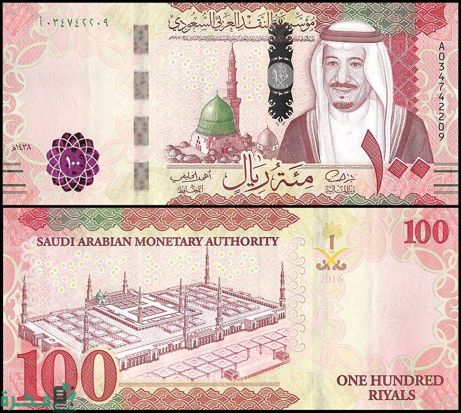 - 100 ريال: لها لون أحمر فاتح بها صورة للملك “سلمان بن عبد العزيز” و “القبة الخضراء” القابعة في المدينة المنورة.