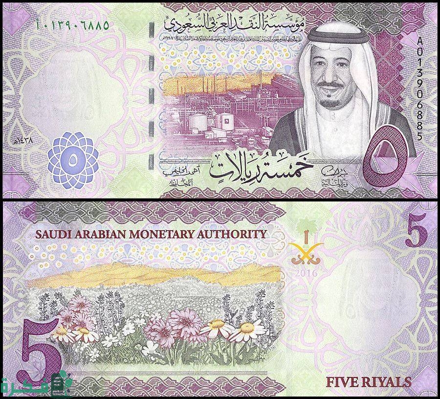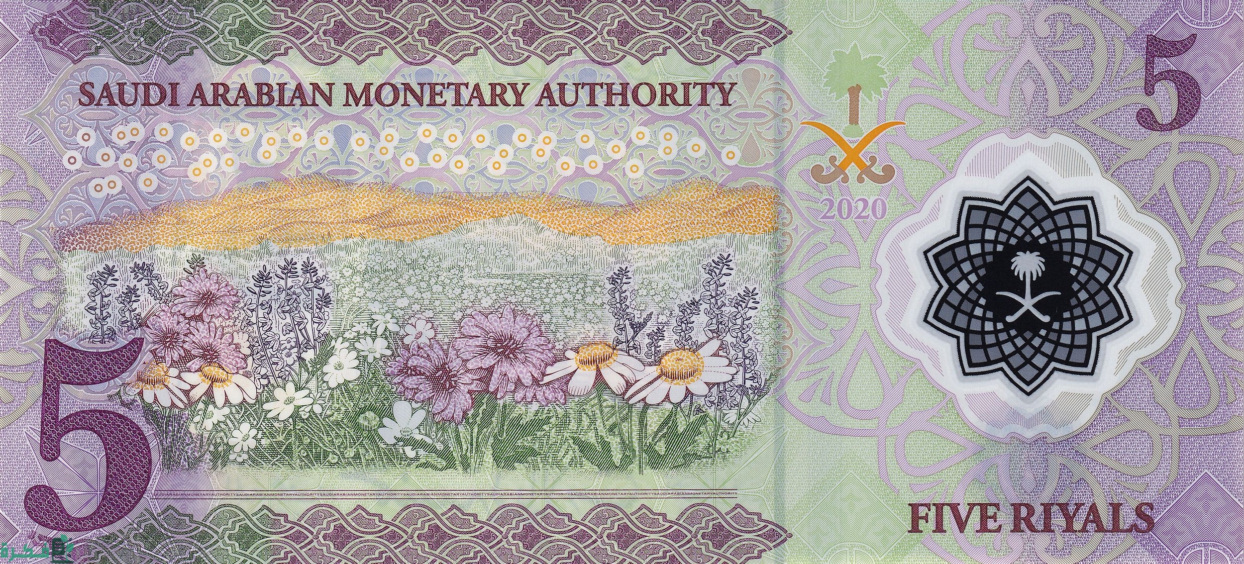 - 5 ريالات بوليمر: مطبوع عليها صورة الملك “سلمان بن عبد العزيز”، وصورة “حقل الشيبة”، بالإضافة إلى صورة لبعض الزهور البرية الجميلة من أراضي السعودية، وشعار رؤية المملكة 2030.