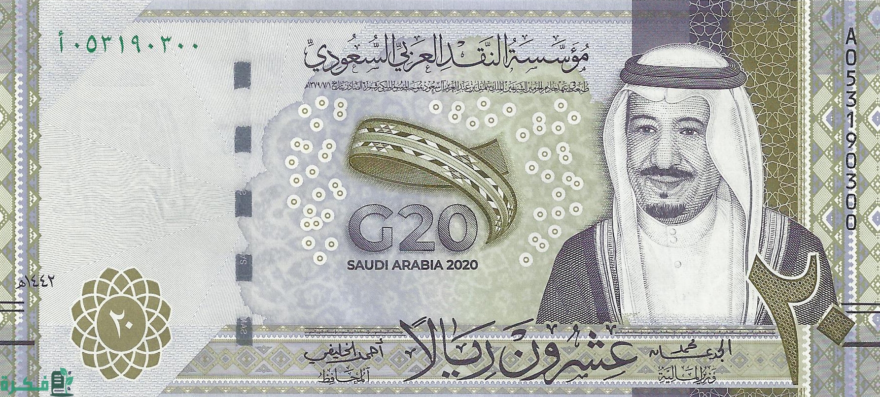 - 20 ريال: تم إصدار هذه الفئة لأول مرة في 25 أكتوبر عام 2020م، وقد طُبع عليها صورة خادم الحرمين الشريفين حفظه الله، وشعار رئاسة المملكة لمجموعة العشرين.