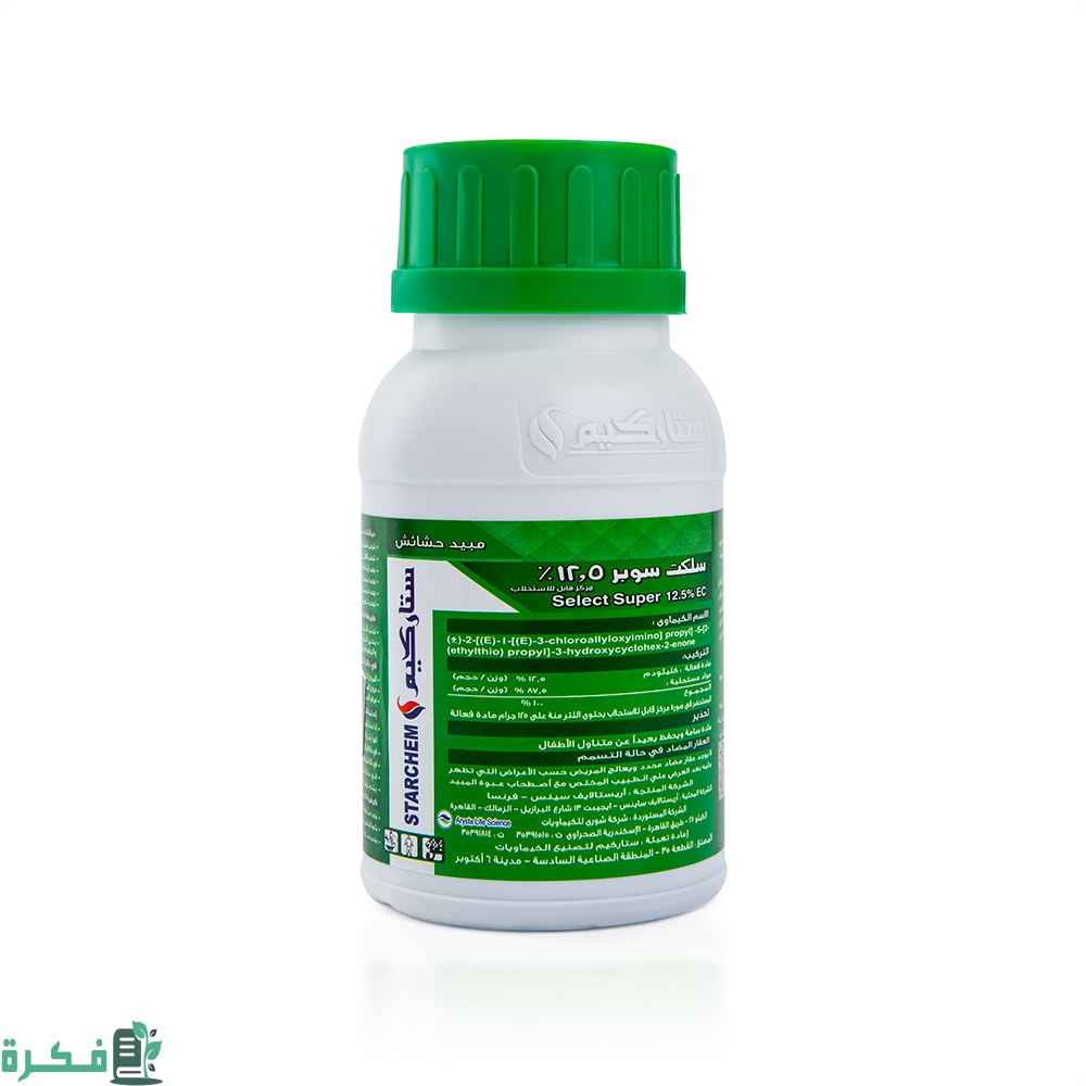 • المادة الفعالة بمبيد سلكت سوبر الكليثودم الذي يتواجد بتركيز 12.5%، ولابد من الإلتزام بمعدلات وطريقة الإستخدام المدونة على العبوة.