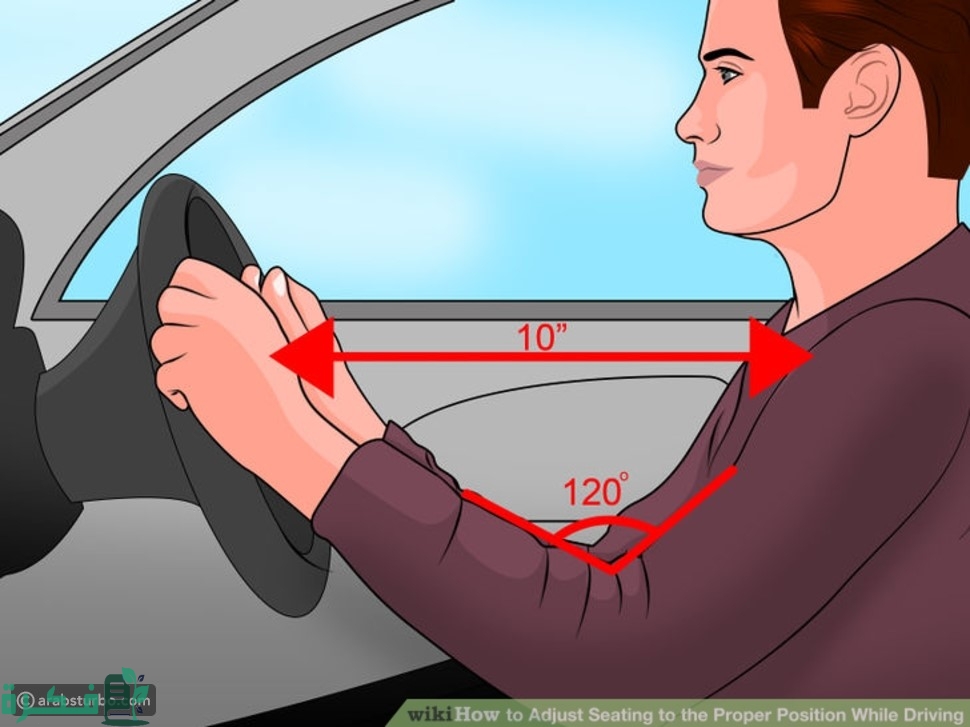 - على قائد السيارة أن يضع اليد على عجلة القيادة مع مراعاة فرد الذراعين على الاستقامة مع إلصاق الجزء الخلفي من الكتف على مسند الظهر.