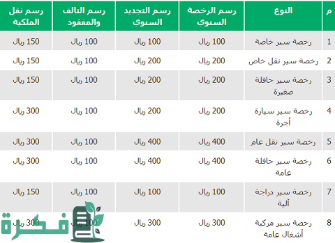 | نوع السيارة | سعر التجديد بالريال السعودي |