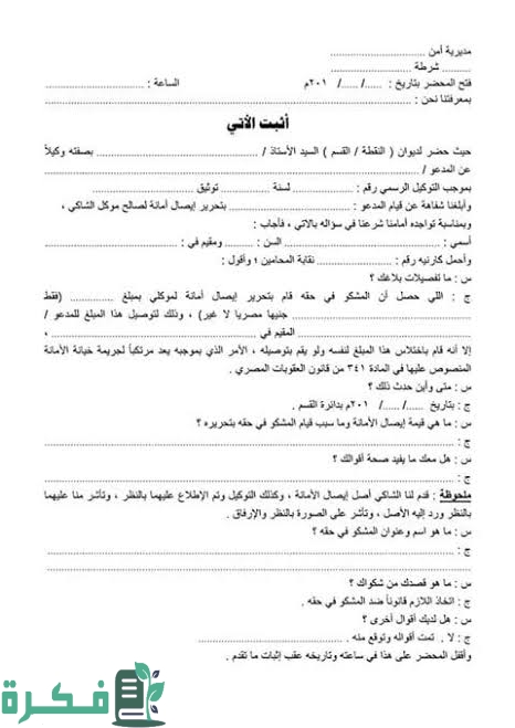 - ومن ثم يتم التقدم بعدد من المستندات للضابط حتى يقوم بتحرير محضر.