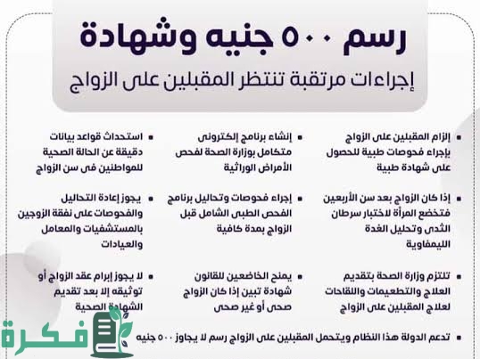 - ان الشهادة الصحية التي يحصل عليها كل شاب وفتاة مقبلين على الزواج يكون لها تاريخ صلاحية وهي ستة أشهر من تاريخ إصدار الشهادة.