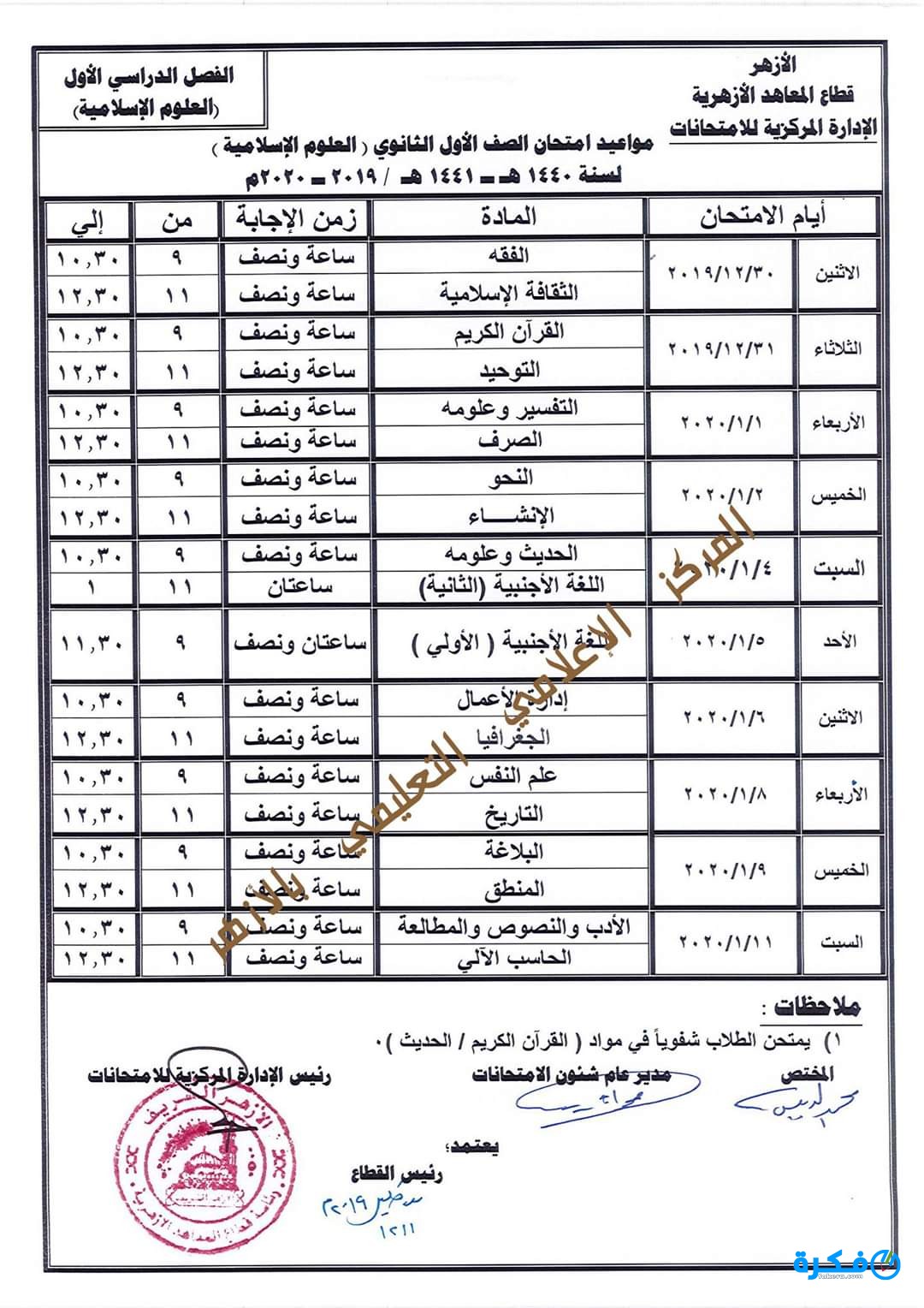جداول امتحانات الصف الأول والثاني الثانوي الأزهري قسم العلومم الإسلامية الفصل الدراسي الأول :