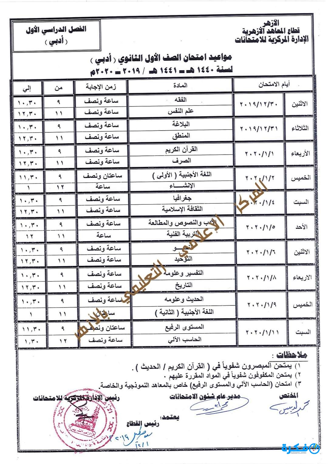 - ومن القرر أن يكون آخر يوم في امتحانات الصف الأول الثانوي الأزهري القسم الأدبي يوم السبت الموافق الحادي عشر من شهر يناير لعام .