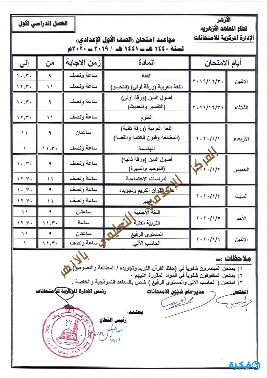 - 11 موعد امتحانات الصف الأول الإعدادي الأزهري الفصل الدرسي الأول :