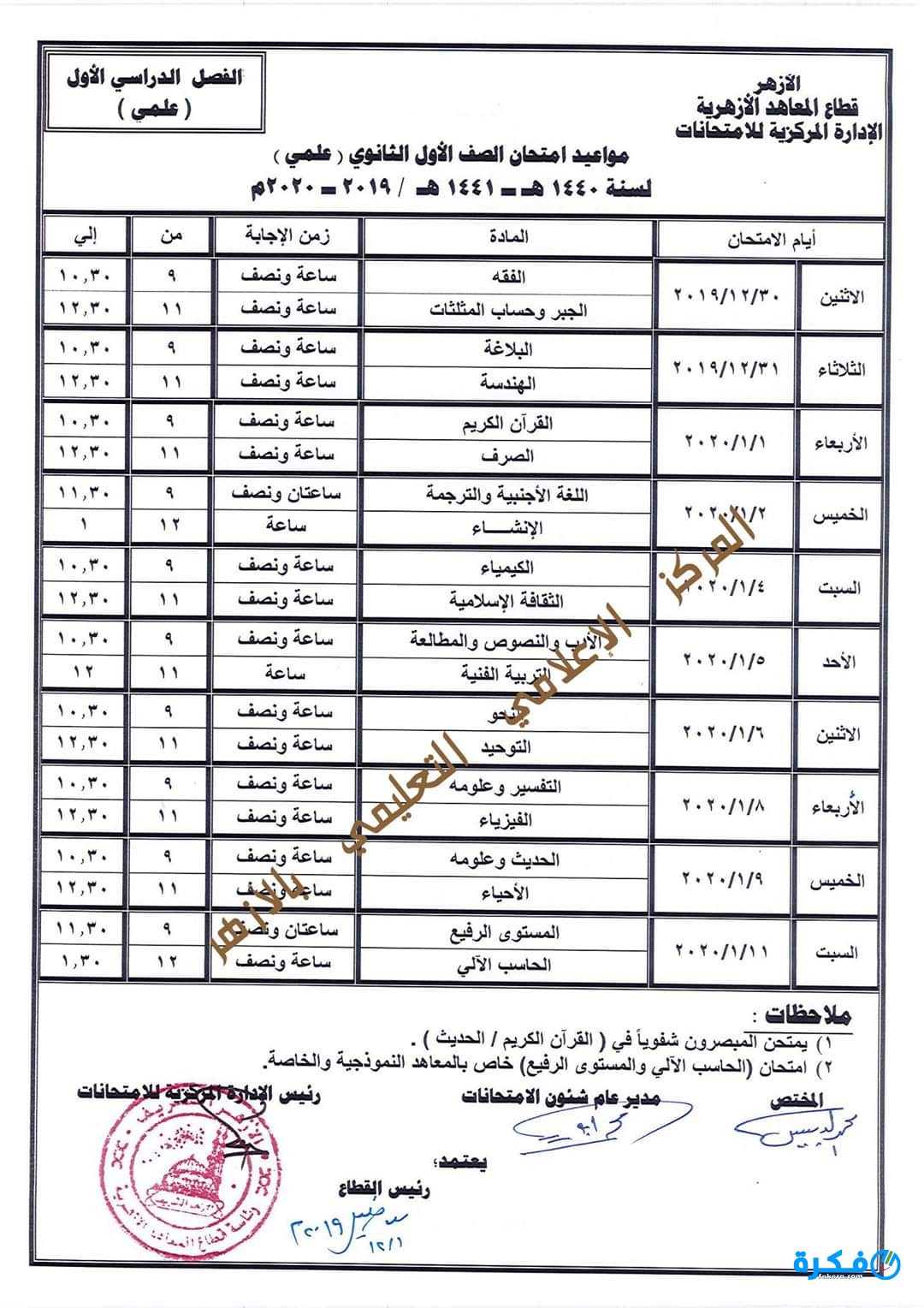 جدول امتحانات الصف الأول الثانوي الأزهري القسم العلمي الفصل الدراسي الأول :