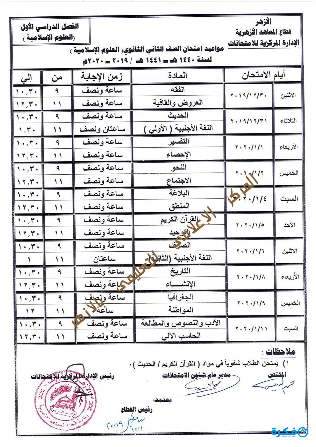 - حدد قطاع المعاهد الأزهرية يوم الإثنين الموافق الثلاثون من شهر ديسمبر الجاري 2019 موعداً لبدء امتحانات الصفي الأول والثاني الثانوي الأزهري قسم العلوم الإسلامية عن الفصل الدراسي الأول لعام .
