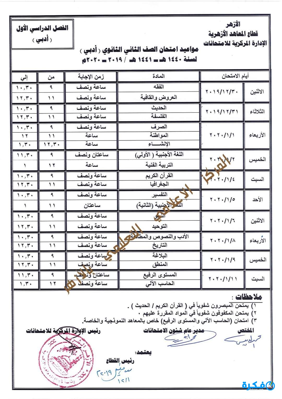 - 19 موعد امتحانات الصف الثاني الثانوي الأزهري القسم الأدبي الفصل الدراسي الأول :