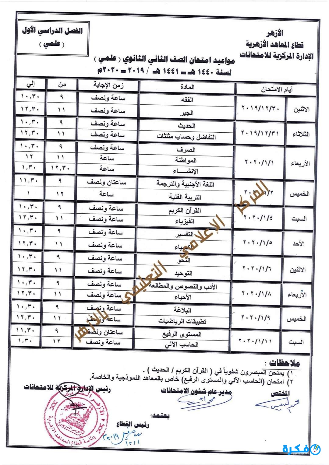 جدول امتحانات الصف الثاني الثانوي الأزهري القسم العلمي الفصل الدراسي الأول :