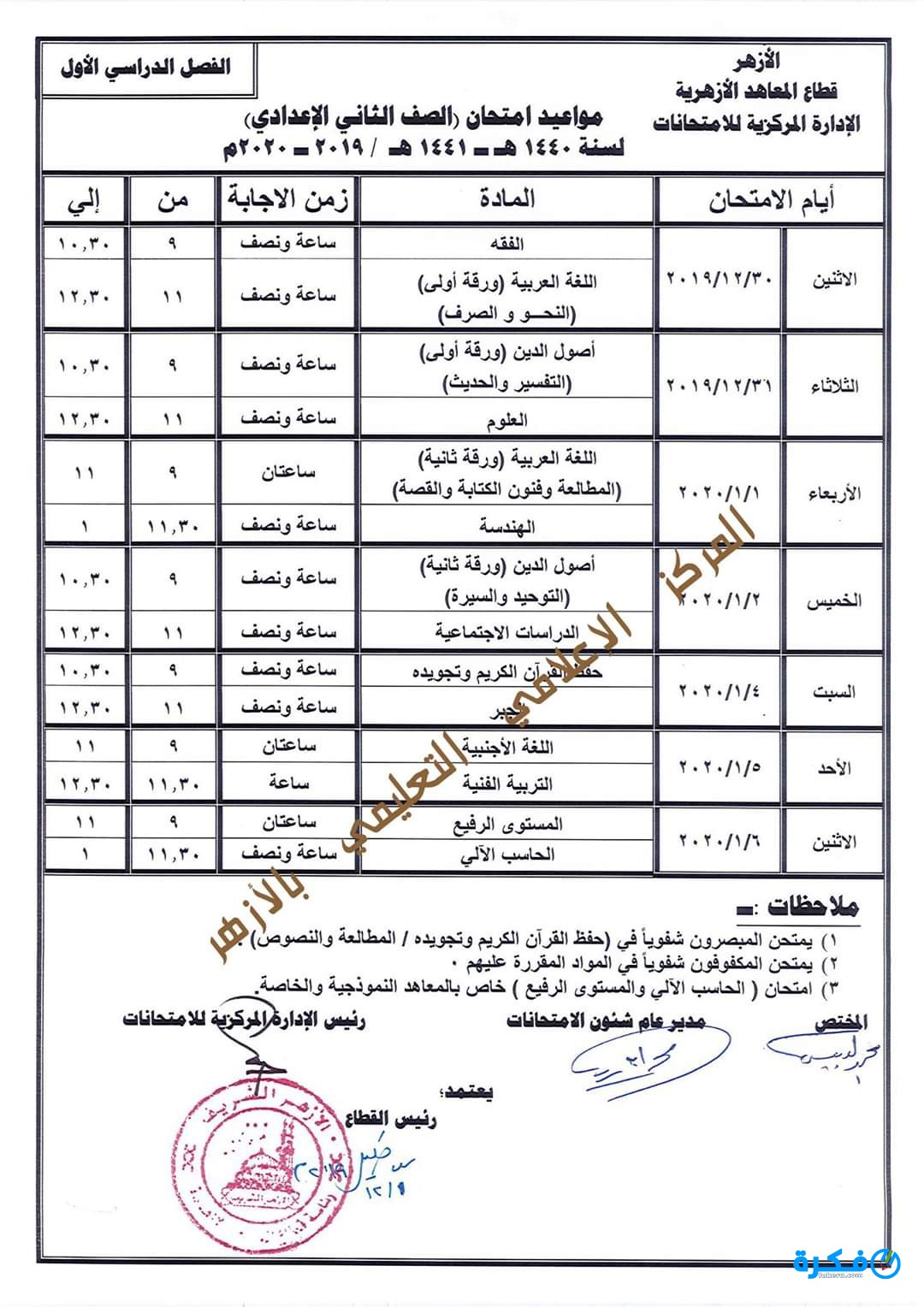- تبدأ امتحانات الصف الثاني الإعدادي الأزهري في يوم الإثنين الموافق الثلاثون من شهر ديسمبر الجاري 2019، وذلك عن الفصل الدراسي الأول لعام .
