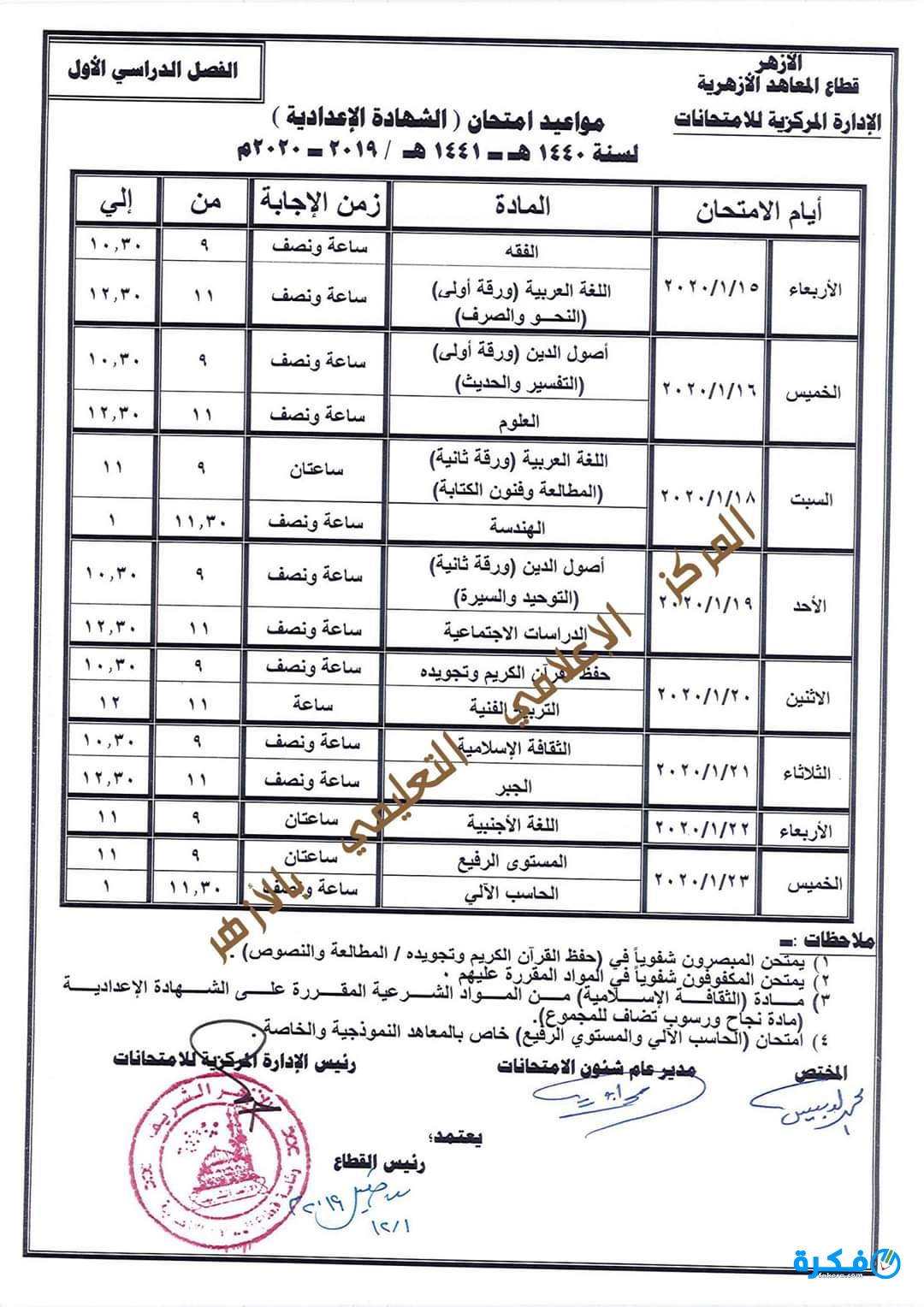 - 7 موعد امتحانات الشهادة الإعدادية الأزهرية الفصل الدراسي الأول لعام :