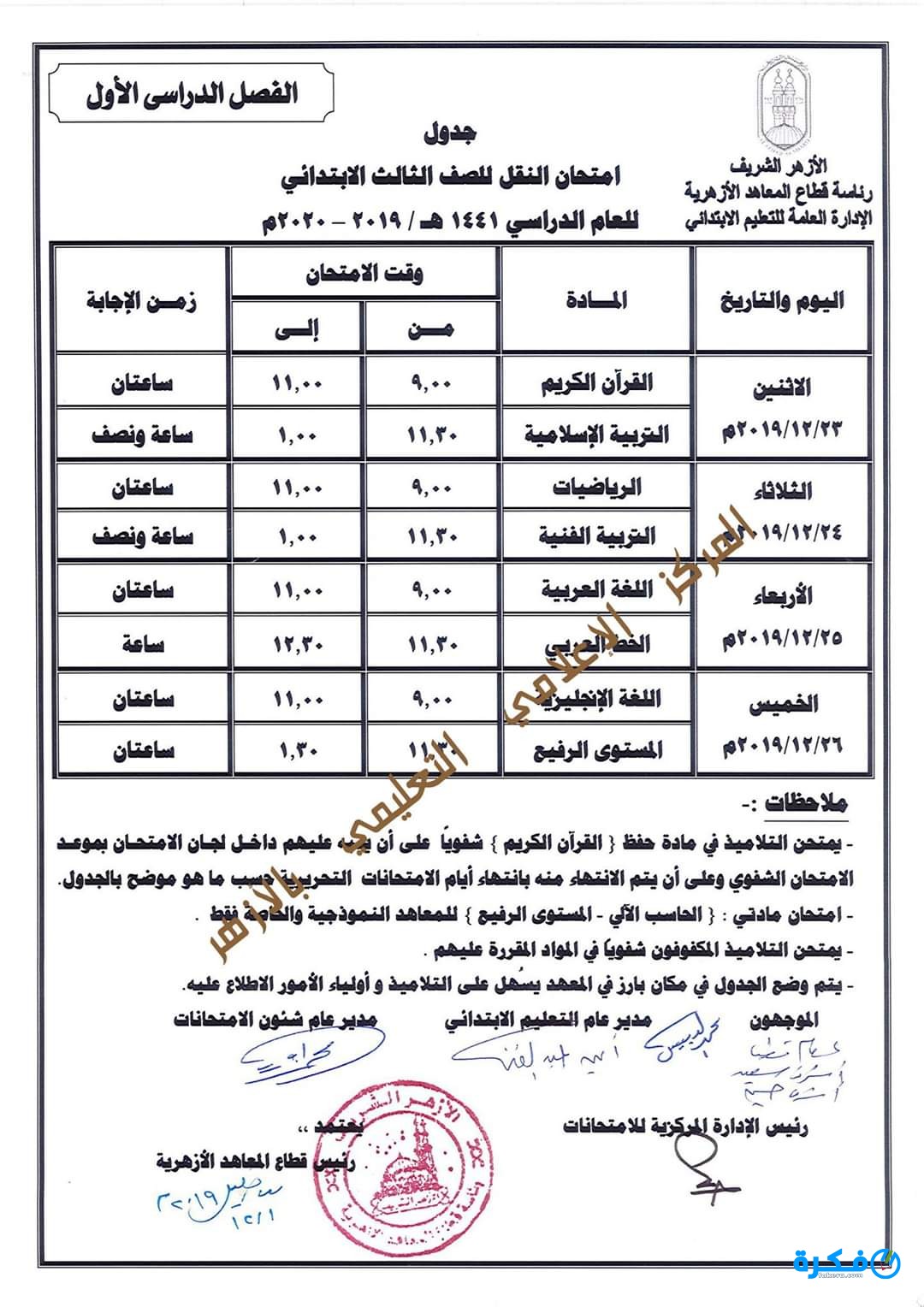 - 5 موعد امتحانات الصف الثالث الابتدائي الأزهري الفصل الدراسي الأول لعام :