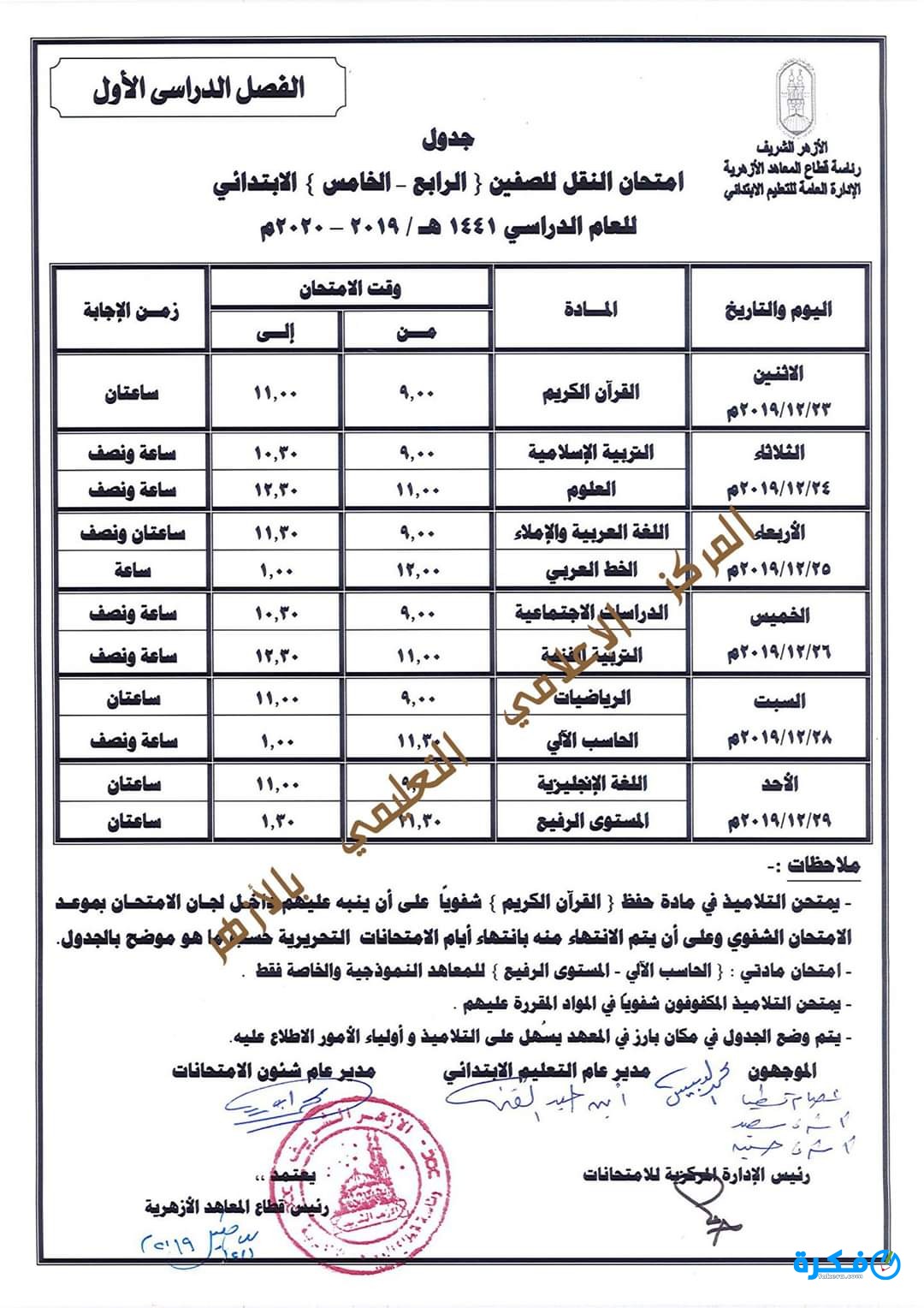 - 4 جدول امتحانات الصف الرابع والخامس الابتدائي الأزهري للفصل الدراسي الأول عام :