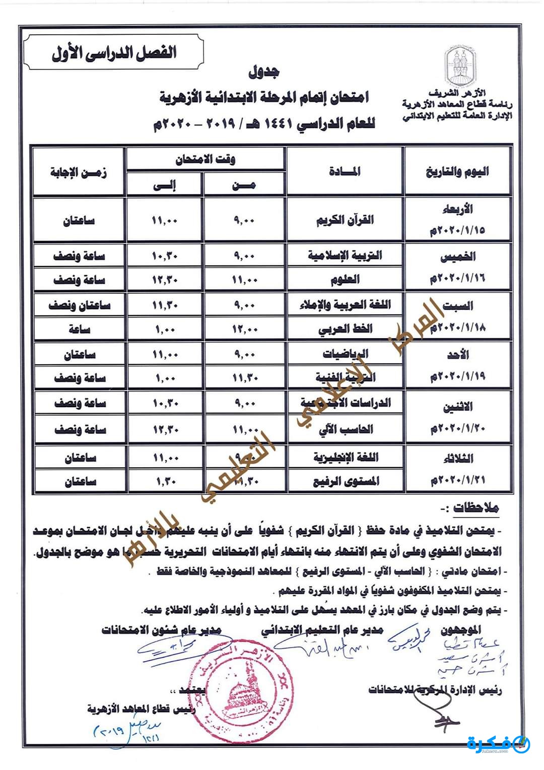 - 2 جدول مواعيد امتحان الشهادة الابتدائية الأزهرية الفصل الدراسي الأول :