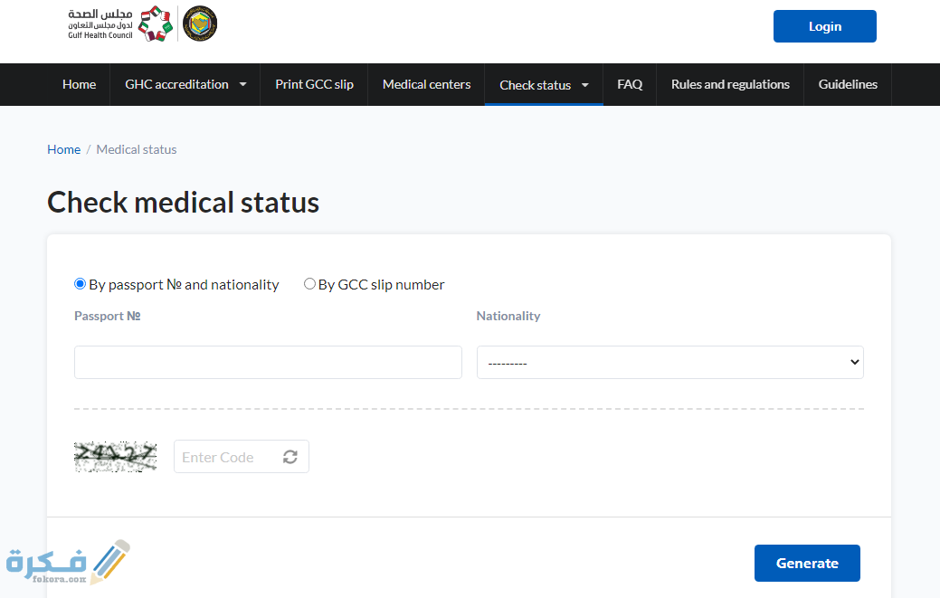 - ثم رقم ادخال جواز السفر في مكانه، واختيار الجنسية ثم ادخال الكود المائى، ثم الضغط على زر “genrate”.