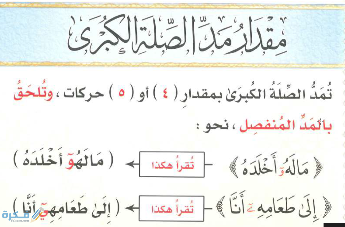 - يكون مقدار المد في مد الصلة الكبرى متوسط بمقدار أربع حركات أو كبير بمقدار خمس حركات متتالية في القراءة .