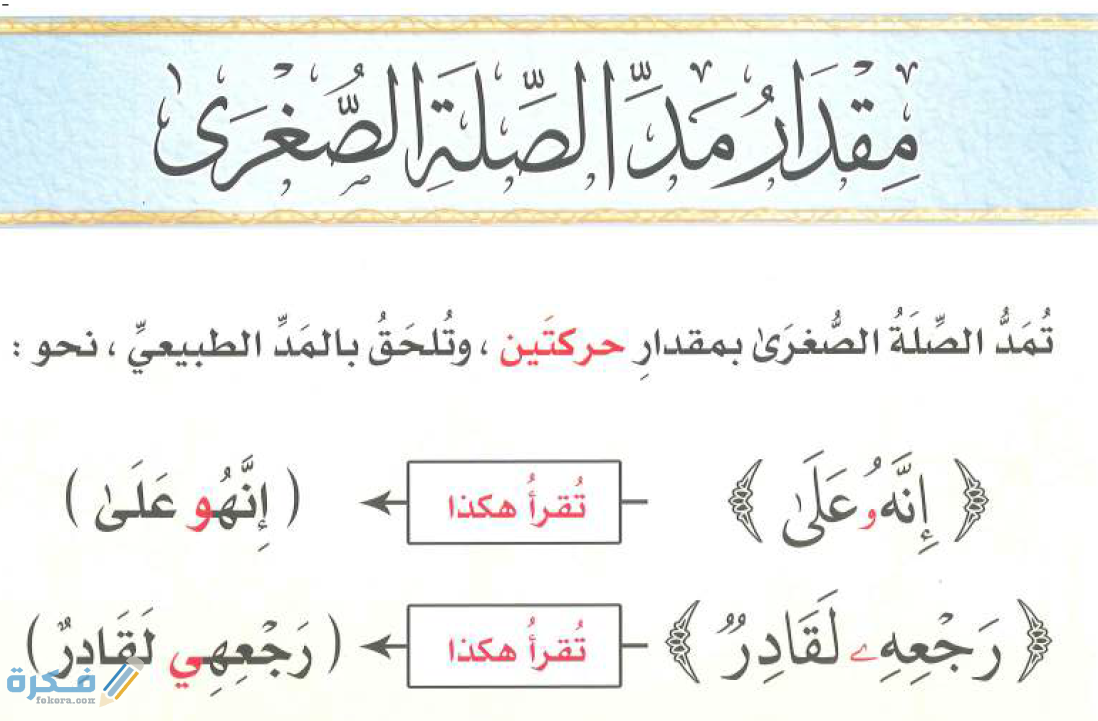 - يكون مد الصلة الصغرى كما تم التوضيح في حرف الهاء المتحرك على ان تتوافر به الشروط الأربعة وهي ” مفرد مذكر غائب ومتحرك يقع بين متحركين .