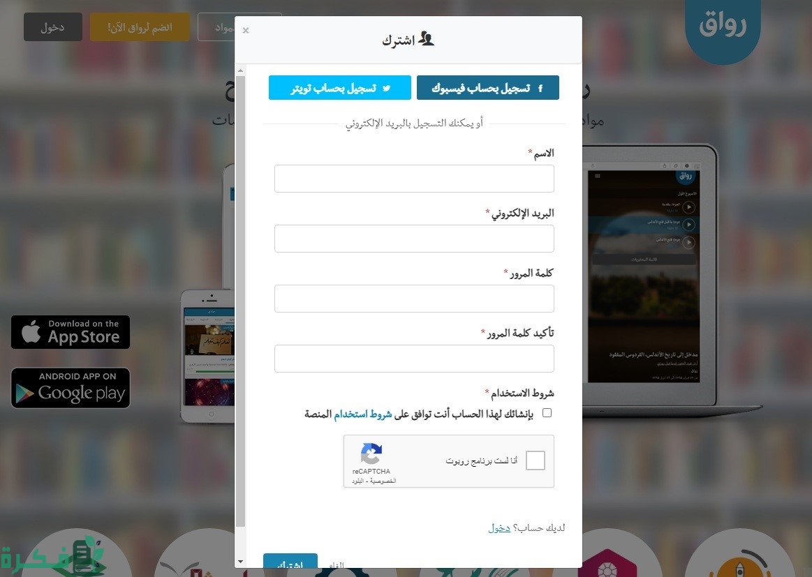 - قم بإنشاء حساب جديد من خلال إدخال حساب الفيس بوك أو حساب تويتر إلى جانب (الاسم – البريد الإلكتروني – كلمة المرور وتأكيدها).