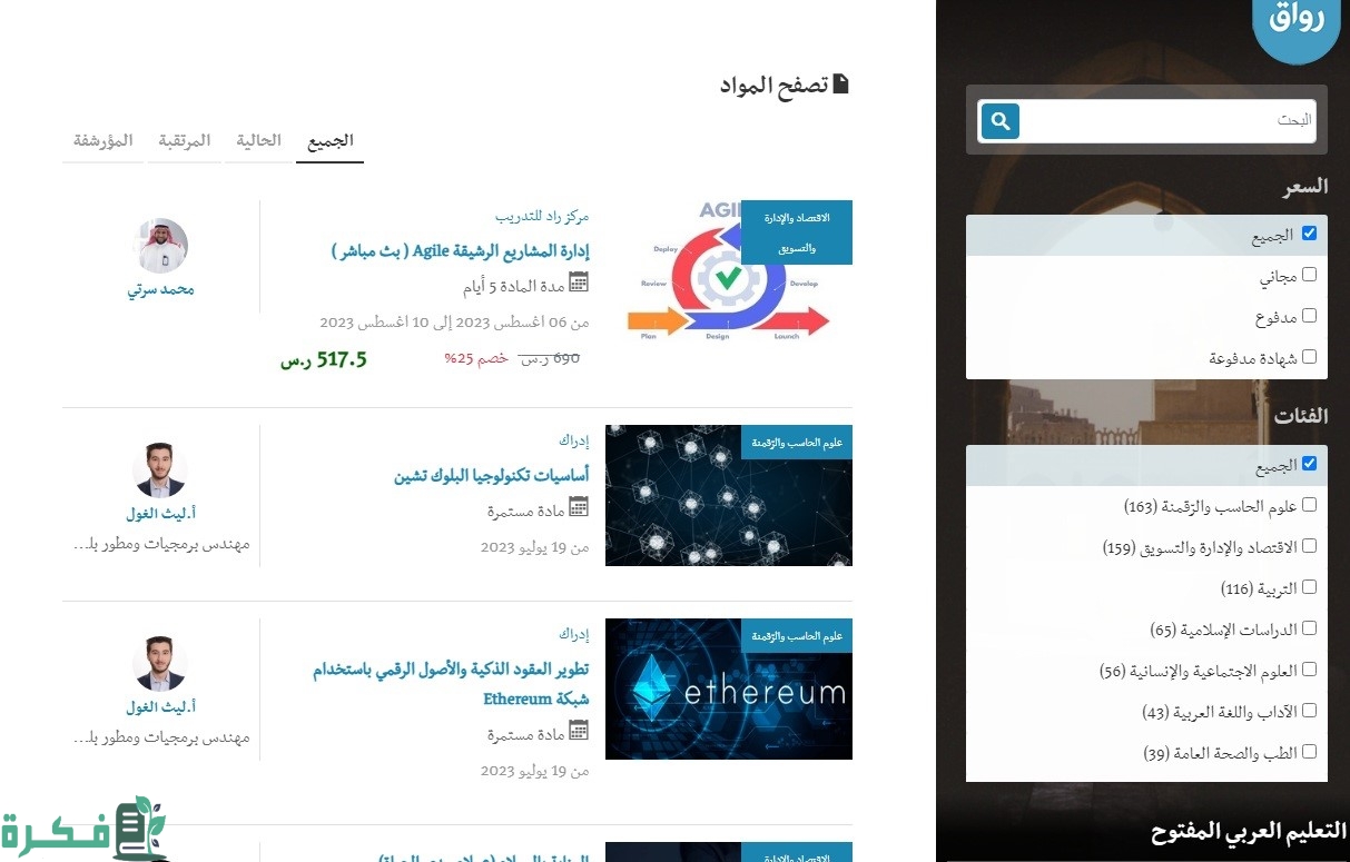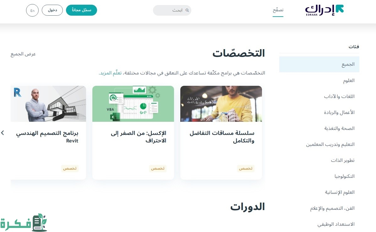 - اختيار قائمة تصفح المواد، وسوف تجد الكثير من الدورات في العديد من المجالات، تستطيع اختيار ما يُناسبك منها.