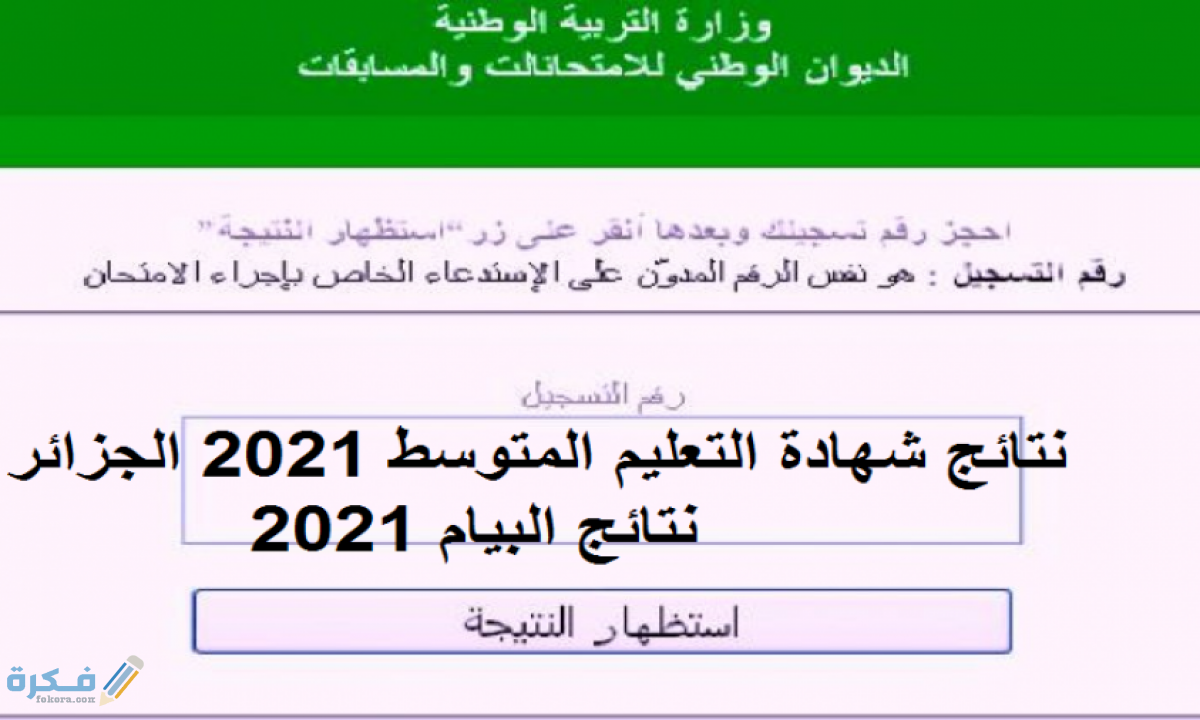 • من اجل الاستعلام عن نتائج شهادة التعليم المتوسط .. البيام 2021 بالجزائر، يجب الدخول الى موقع الديوان الوطنى بالجزائر من هنا لكشف نتائج البيام 2021.