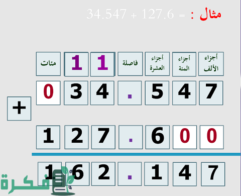 في الخطوات التالية سنتعرف إلى كيفية جمع وطرح الأعداد العشرية بصور عمودية:
