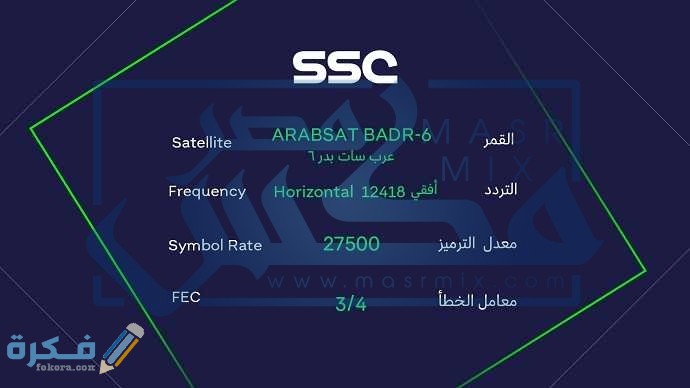- التردد : 12418، الاستقطاب : افقي، معامل التصحيح : 27500 معدل الترميز : ⅔ ، أسم القناة : ssc، القمر الصناعي : بدر سات.