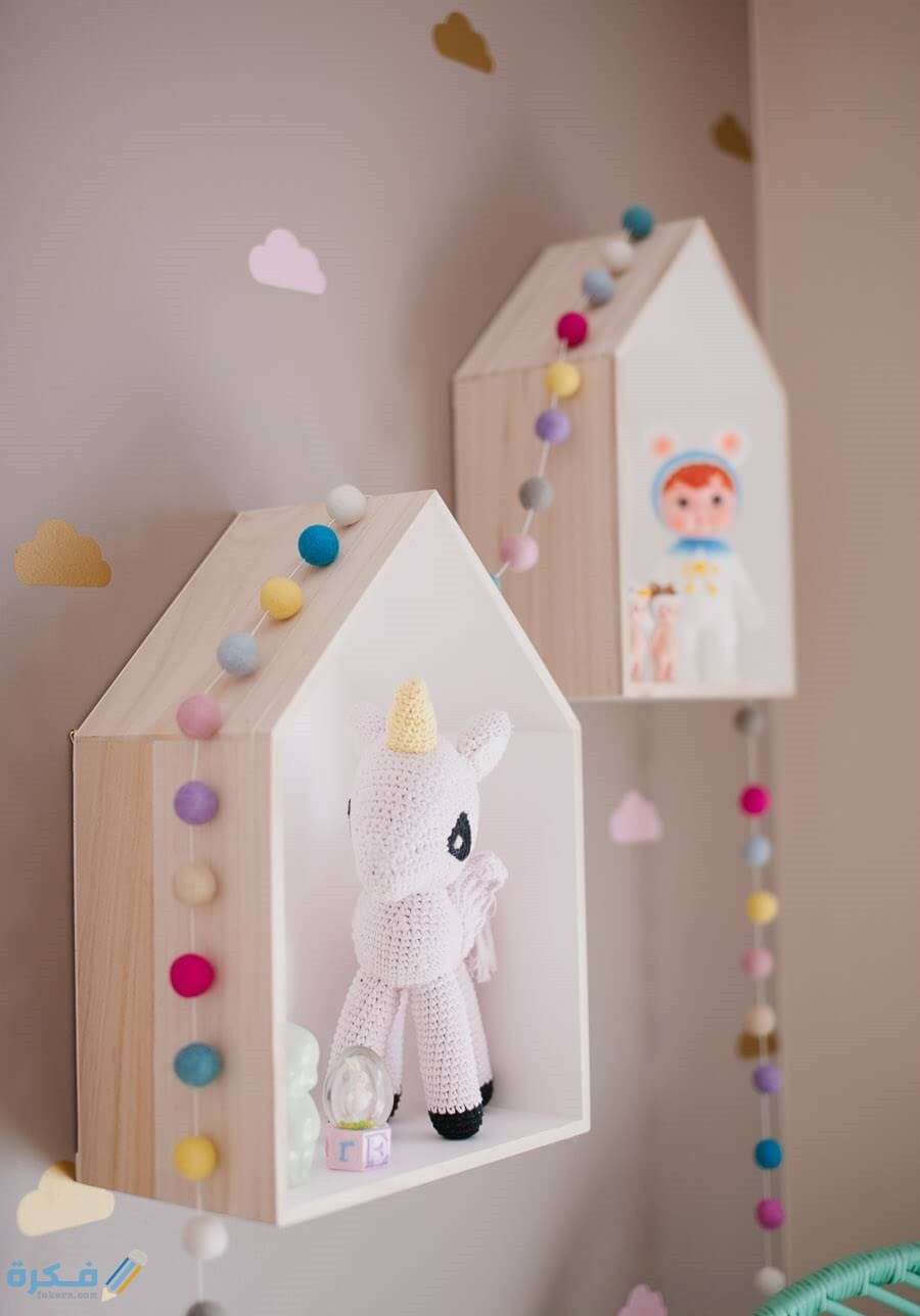 في الصورة الموجودة أمامنا نظرا لأنه غرف البنات تحتوي على عدد كبير جدا من الدمى والعرايس والألعاب الخاصة بهم تم تخصيص هذا الجزء من الحائط لوضع العرائس الخاصة بالبنات في هذه الجزئية و ترتيبها بشكل منظم حتى تعطي الغرفة شكل ديكوري رائع وأيضا تحافظ على نظافة الغرفة وجودة الألعاب.