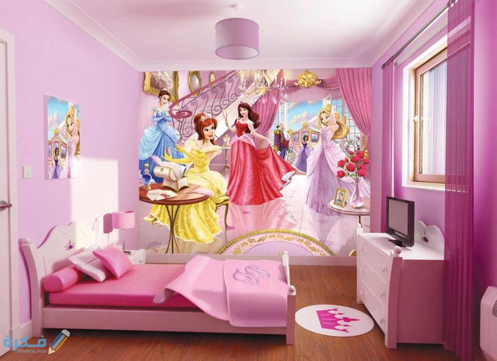 أما عن تصميم في هذه الغرفة رائعة هي مميزة جدا لأنه تم استخدام أحد الحوائط لرسم عليها بعض الرسومات التي تعبر عن الميول الخاص بالبنات وهو الكرتون الخاص بالإميرات هو واحد من الأشياء المميزة والمحبوبة جدا للبنات بالتحديد .