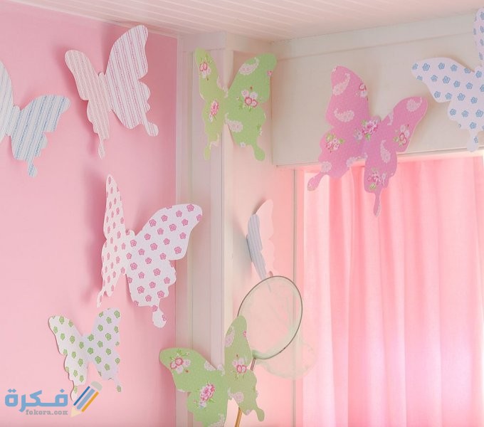 تم الاعتماد على الأوراق الكرتونية المرنة القوية بعض الشيء في قص اشكال الفراشات بالألوان المختلفة و تم تعليقها على الحائط لتعطي شكل ديكوري جدا وهي واحدة من أهم اهتمامات البنات وتناسب ألوان الفراشات الرقيقة والهادئة.