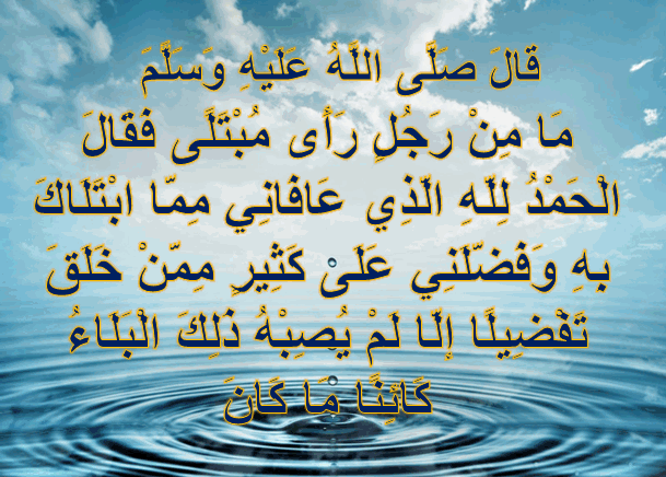 - في الحديث الذي رواه أبو هريرة وعبد الله بن عمر عن رسول الله صلى الله عليه وسلم أنه قال “من رأى مبتلى فقال : الحمد لله الذي عافاني مما ابتلاك به ، و فضلني على كثير ممن خلق تفضيلا ، لم يصبه ذلك البلاء”