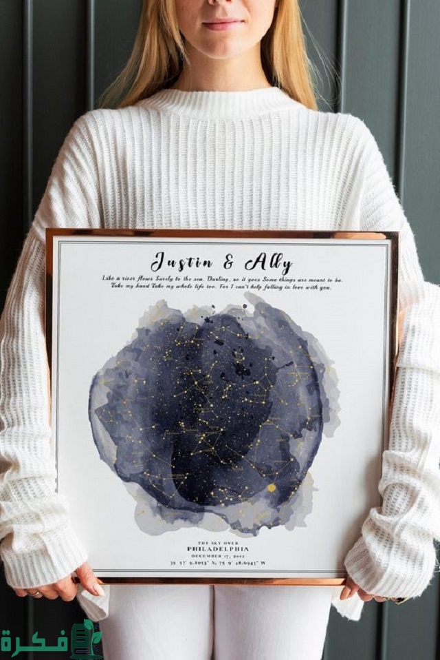 - خريطة النجوم، حيث تختارها بشكل مشابه للنجوم في الليلة التي أغلقت فيها عينيها وقالت إنها تحبك، أو قبلت الزواج منك، مما سيعيدها إلى هذه اللحظة التي كان الشغف ينبض بالحياة في قلبها، كما ستستحضر نفس المشاعر الرقيقة التي كانت تشعر بها تجاهك حينها.