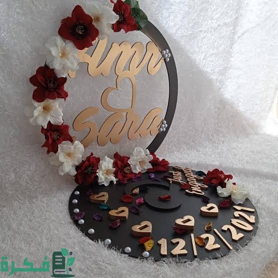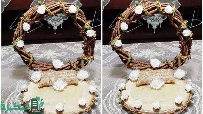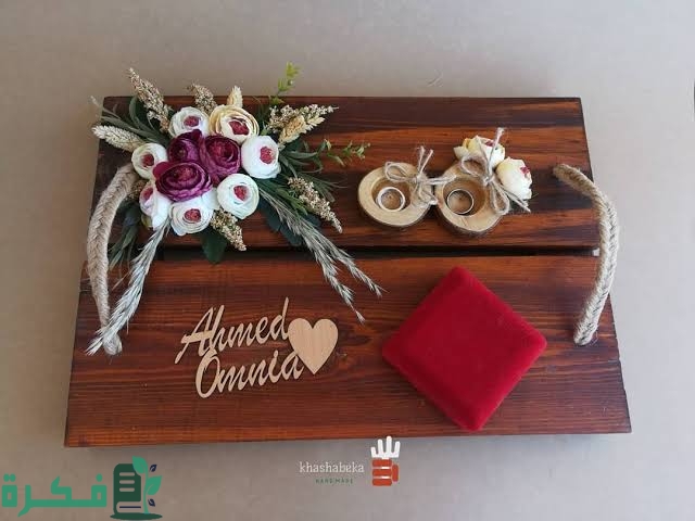 ‏هذا أيضا تصميم رائع لصينيه خشبية تم وضع على أحد الجوانب ورود مميزة جدا لتعطيها شكل رائع وتم استخدام الأيدي الخاصة بالصينيه من الحبال ويوضع الدبل في مكان مخصص لها وكتبت اسم العروسين على الصينية الخشبية.