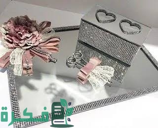 ‏واحد من أهم وأشهر التصميمات الشهيرة جدا والرائعة هذه الصورة فتم استخدام صينية لامعة وتم تزيين الحواف الخاصة بها بفصوص من الخرز الأبيض والنحاس واستخدام شريط شفاف أيضا وورود النحاسية من نفس اللون وتم تصميم الصينية شيك جدا وبسيطة ومختلفة.