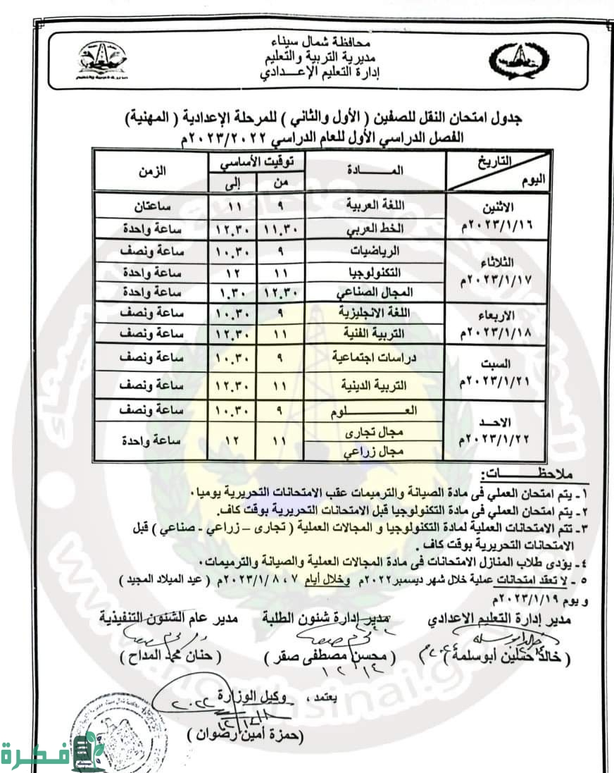 جدول الصف الأول الثانوي بمحافظة شمال سيناء