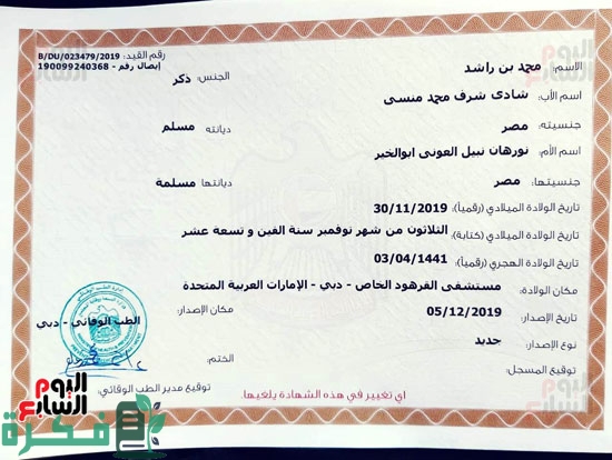 - البيانات التي تظهر في شهادة ميلاد مولود دولة الإمارات كغيرها من أغلب الشهادات حول العالم.