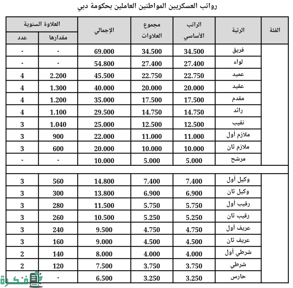 - حيث يصل راتب اللواء إلى 69.000 درهم إماراتي وتتدرج الرواتب حتى راتب الحارس في القوات العسكرية والذي يصل الى 6500 درهم إماراتي.