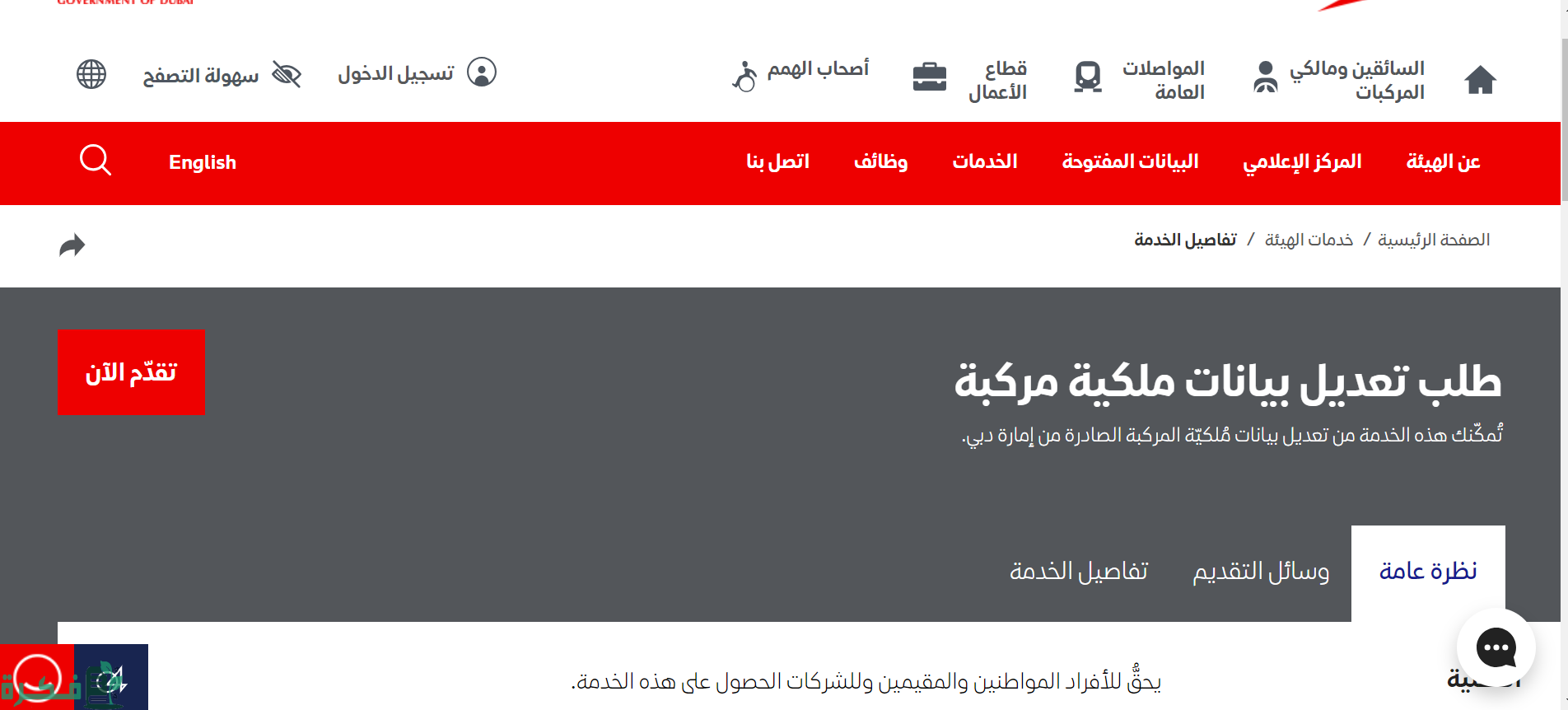 - أو من خلال الموقع الرسمي لهيئة الطرق والمواصلات بدبي، للدخول إلى خدمة طلب تعديل بيانات ملكية اضغط على هذا الرابط.