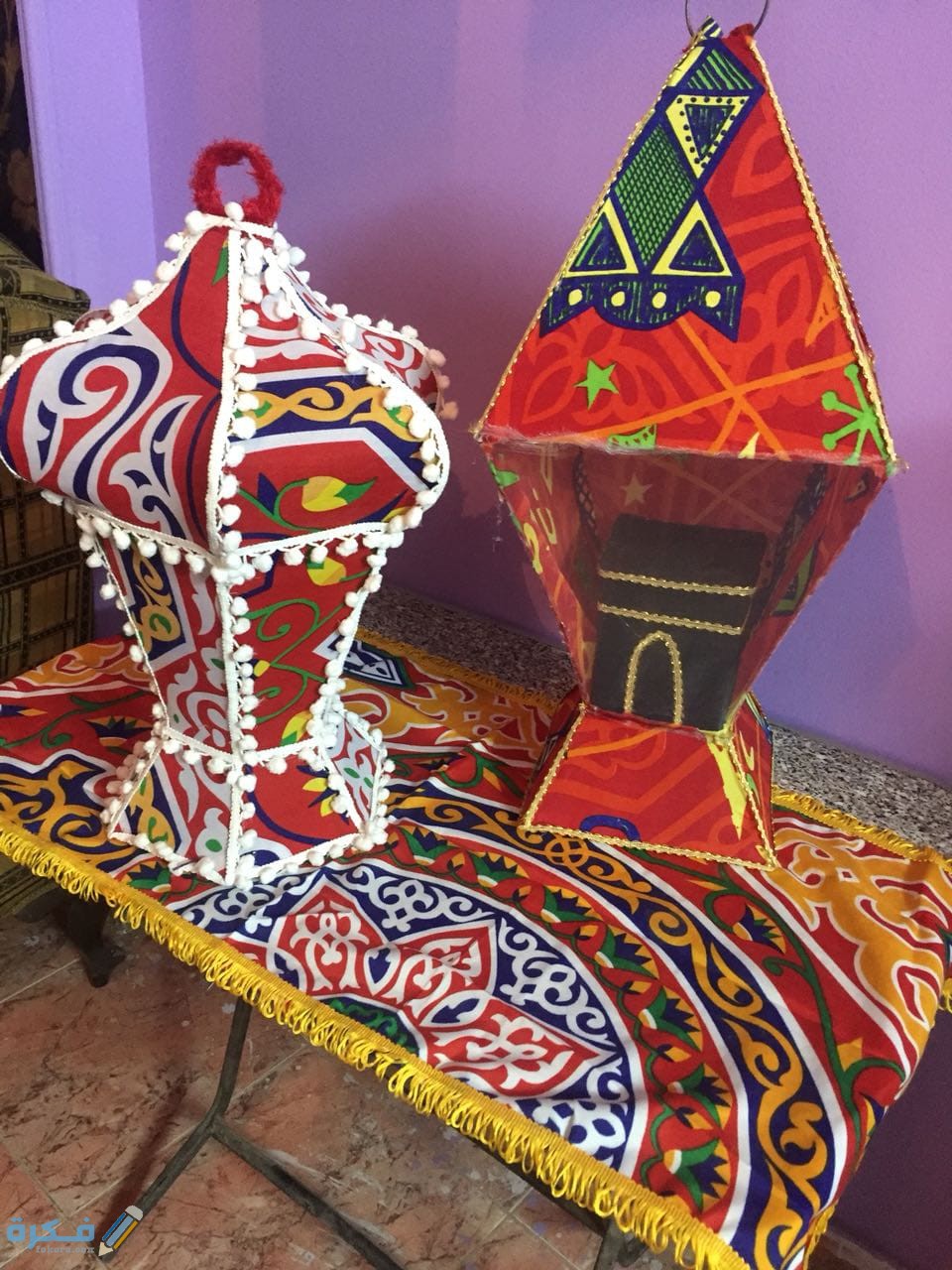 هذه الفوانيس مصنوعة من كثير من الأشياء الملونة  فنري في الصورة لإحدى الفوانيس صورة الكعبة المشرفة والفانوس الثاني الاخر مطرز ببعض الزينة البيضاء التي أضافت له شكل مميز وجذاب .