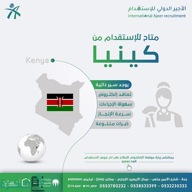 ما هي طريقة الاستقدام من كينيا وما هي أفضل مكاتب الاستقدام من كينيا؟ لقد أصدرت وزارة العمل والتنمية الاجتماعية في المملكة العربية السعودية بيان عن عقد اتفاق مع دولة كينيا لاستقدام العمالة المنزلية منها، وذلك لكثرة الطلب عليها في المملكة لِما يتميزون من خبرة طويلة في هذا المجال، فضلًا عن الرُقي والاحترام في التعامل مع أصحاب المنزل.