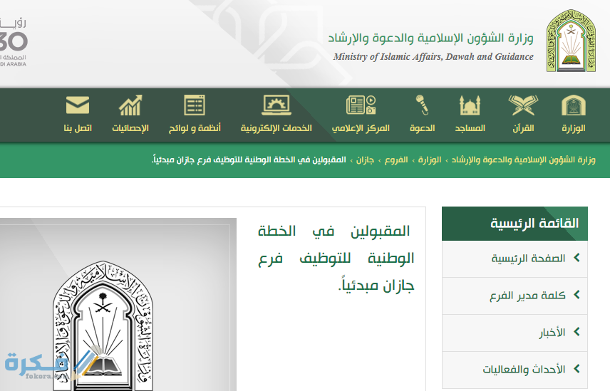 - حيث يتم الدخول على صفحة المقبولين في الوظائف من موقع وزارة الشؤون الإسلامية “من هنا“، وسيظهر لك عبر هذا الرابط أسماء المقبولين في الخطة الوطنية للتوظيف فرع جازان على شكل صفحة بي دي إف، يمكن تنزيله بسهولة.