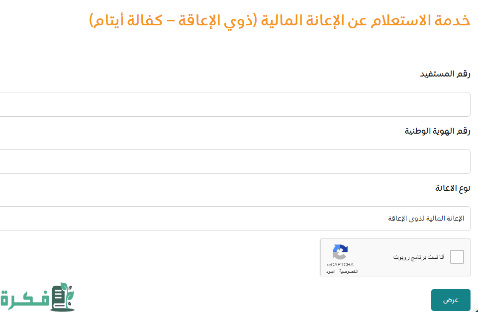 - إدخال المعلومات المطلوبة (رقم المستفيد، رقم الهوية الوطنية، نوع الإعانة).