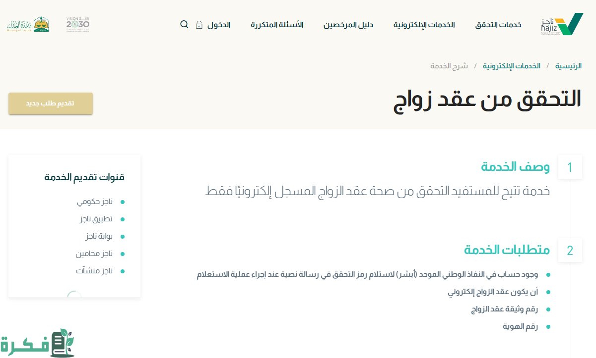 التحقق من عقد زواج من خلال ناجز najiz.sa تعتبر من الخدمات الاستعلامية الهامة التي تسهل الإجراءات القانونية في المملكة من خلال عدة خطوات مبسطة، حيث تعمل على مساعدة المواطنين في التأكد من صحة العقد دون اللجوء إلى المقرات الحكومية بهدف توفير الوقت والجهد، وهذا ما يعمل موقع فكرة على شرحه.
