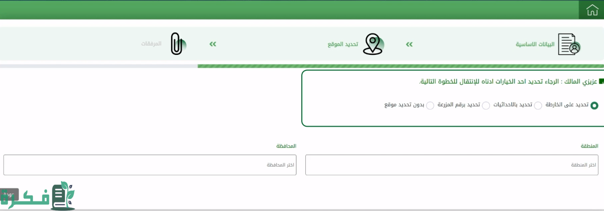 - من ثم يتعين تحديد الموقع، من خلال اختيار المنطقة، والمحافظة، قم النقر على التالي.
